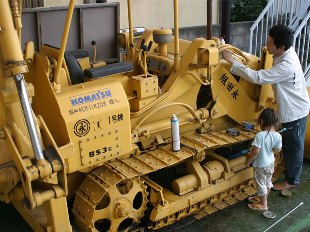 下記ブルドーザー(左側の写真)は、永田準造が昭和45年に一番最初に購入した歴史ある機械です。愛着を感じながら大事に平成3年まで使ってきましたが、創立30周年を機に永田準造の功績を永遠のことと致したく永久保存することと致しました。