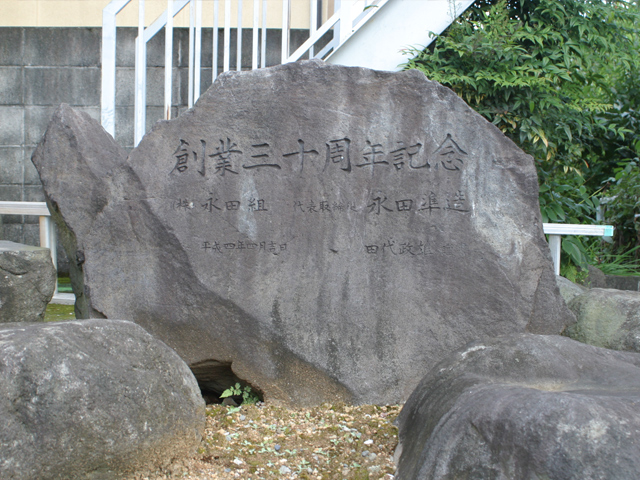 又、下記石碑(右側の写真)は田代正雄氏の自筆により彫らさせて頂きました。当永田組も亀のようにゆっくり歩いていきたいと思い亀に似た石を選びました。